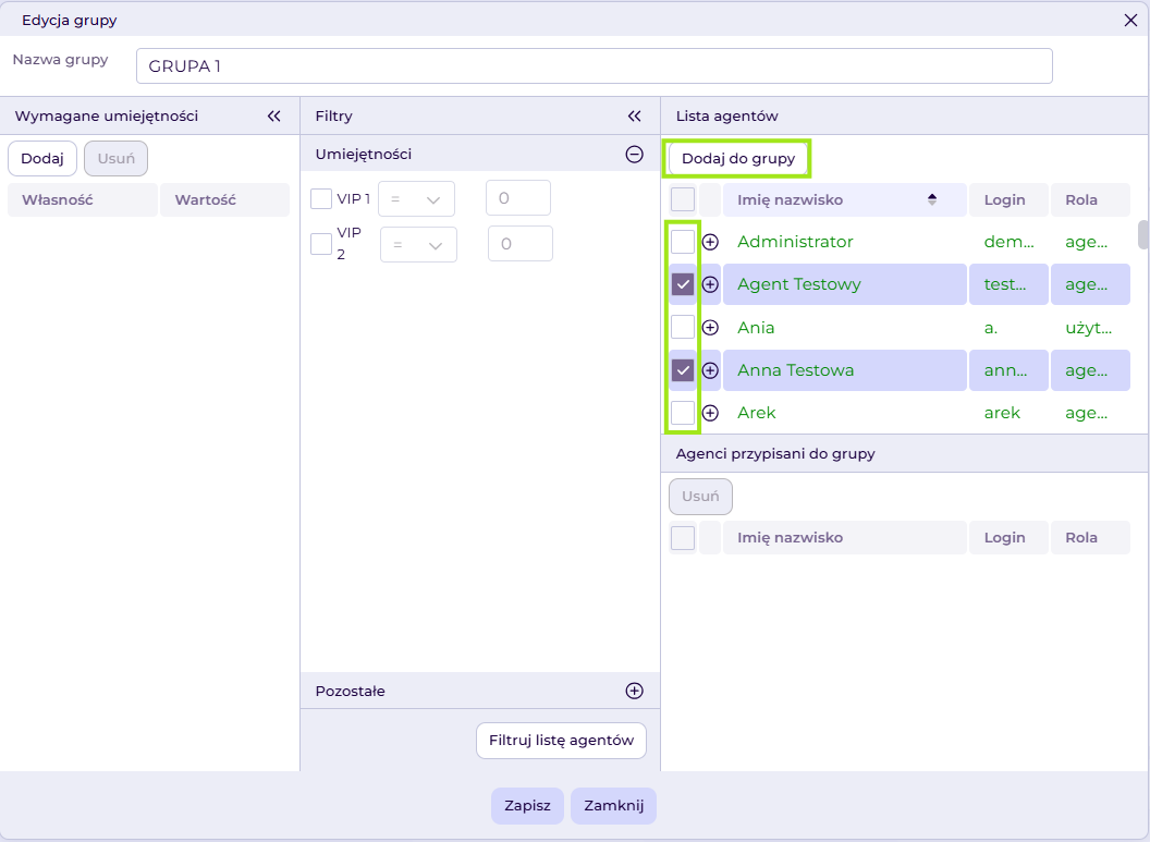 2. Druga część okna definiowania grupy to Wymagane umiejętności. W tym miejscu definiujemy umiejętności dla tworzonej grupy agentów.