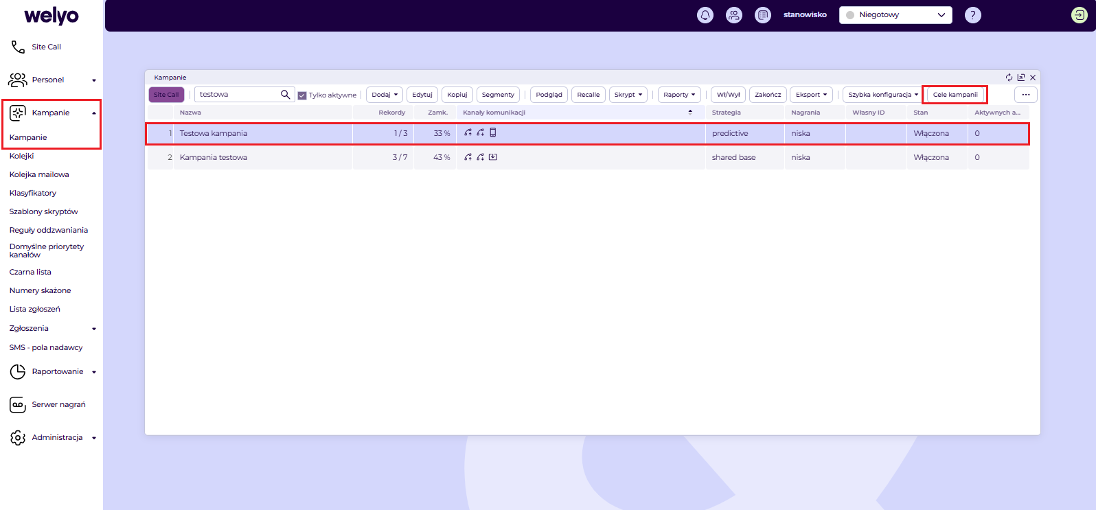 Funkcja ta umożliwia zdefiniowanie celu kampanii do zrealizowania w wybranej infolinii. Dodatkowo dostępny będzie monitoring celu kampanii, dzięki czemu możliwy będzie nadzór realizacji celu.
