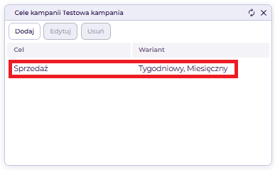 Dodaj – umożliwia utworzenie nowego celu kampanii. Dla jednej kampanii możliwe jest zdefiniowanie kilku różnych celów.