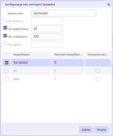 W następnym kroku konieczne jest zdefiniowanie klasyfikatorów i ich wartości. Na liście dostępne są klasyfikatory z cechą sukces, które są dodane w kampanii. Zaznaczenie checkboxa obok wybranego klasyfikatora umożliwi zdefiniowanie jego wartości, która będzie uwzględniana przy realizacji celu.