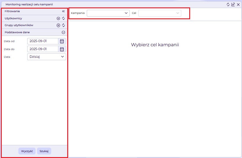 W Panelu nadzorcy możliwe jest monitorowanie realizacji celów kampanii. W tym celu przechodzimy do zakładki Monitoring > Cel kampanii. Otworzy się okno, w którym możemy wyfiltrować potrzebne dane.