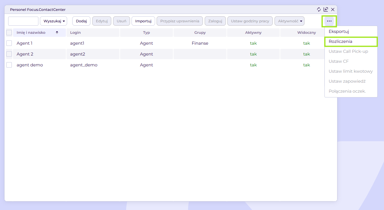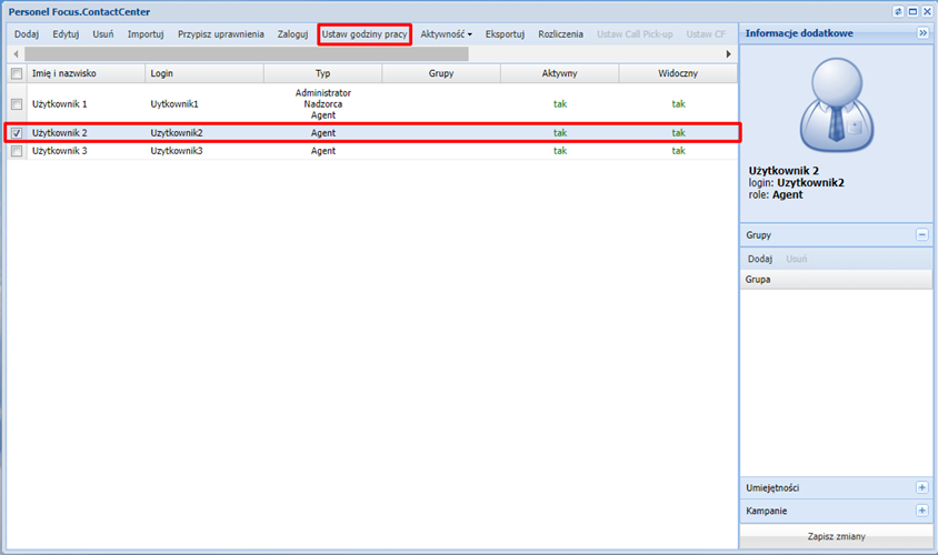 Na podstawie zdefiniowanych godzin pracy agentów system będzie prognozował, kiedy agent osiągnie założony cel. Po zalogowaniu do platformy przechodzimy do zakładki personel -> użytkownicy. Następnie wybieramy użytkownika i klikamy ustaw godziny pracy.