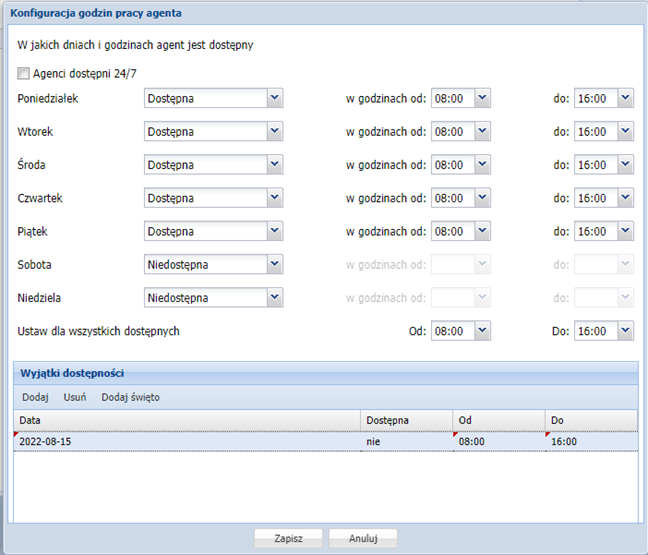 Otworzy się okno, w którym definiujemy dni i godziny pracy agenta. Możliwe jest też wprowadzenie wyjątków dostępności, np. dni ustawowo wolne od pracy lub urlop agenta.