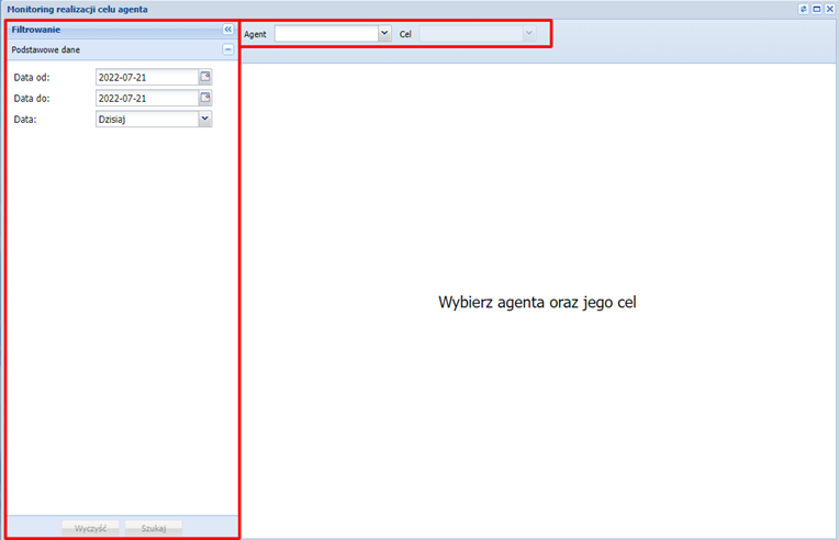 W panelu nadzorcy możliwe jest monitorowanie realizacji celów kampanii. W tym celu przechodzimy do zakładki monitoring -> cel agenta. Otworzy się okno, w którym możemy wyfiltrować potrzebne dane.