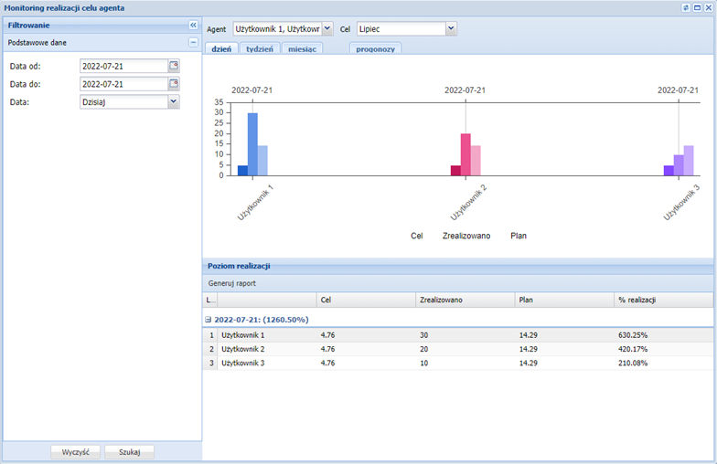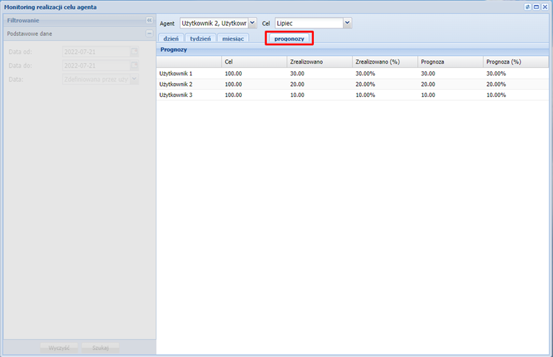 W zakładce prognozy widoczne będą przewidywania realizacji celu przez agentów. Prognozy uwzględniają zdefiniowane godziny pracy agentów.