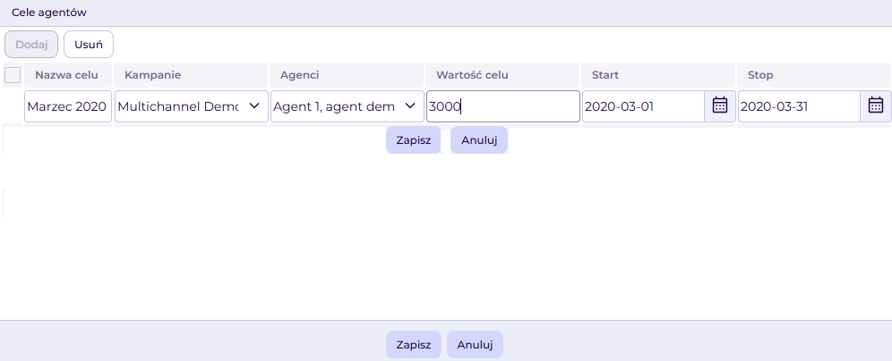 Funkcja ta umożliwia zdefiniowanie celu agenta do zrealizowania w wybranej kampanii. Dodatkowo dostępny będzie monitoring celu agenta, dzięki czemu możliwy będzie nadzór nad realizacją celu.