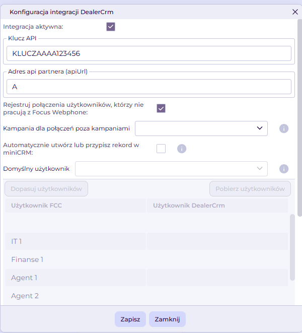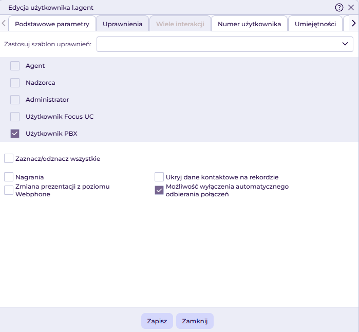 W integracji z Dealer CRM aktywni mogą być jedynie użytkownicy PBX (Personel > Użytkownicy > Dodaj/Edytuj> Uprawnienia > użytkownik PBX).