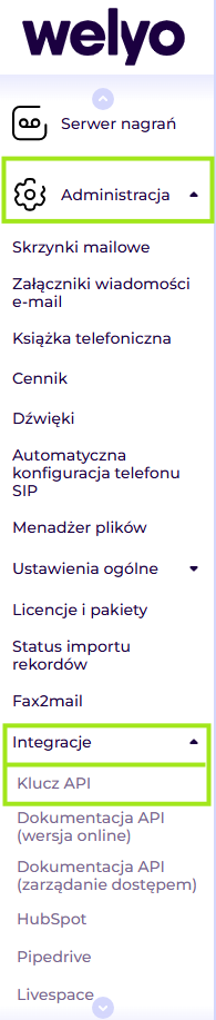 3. Klucz API – informacja ta dostępna jest w zakładce Administracja > Integracje > Klucz API.