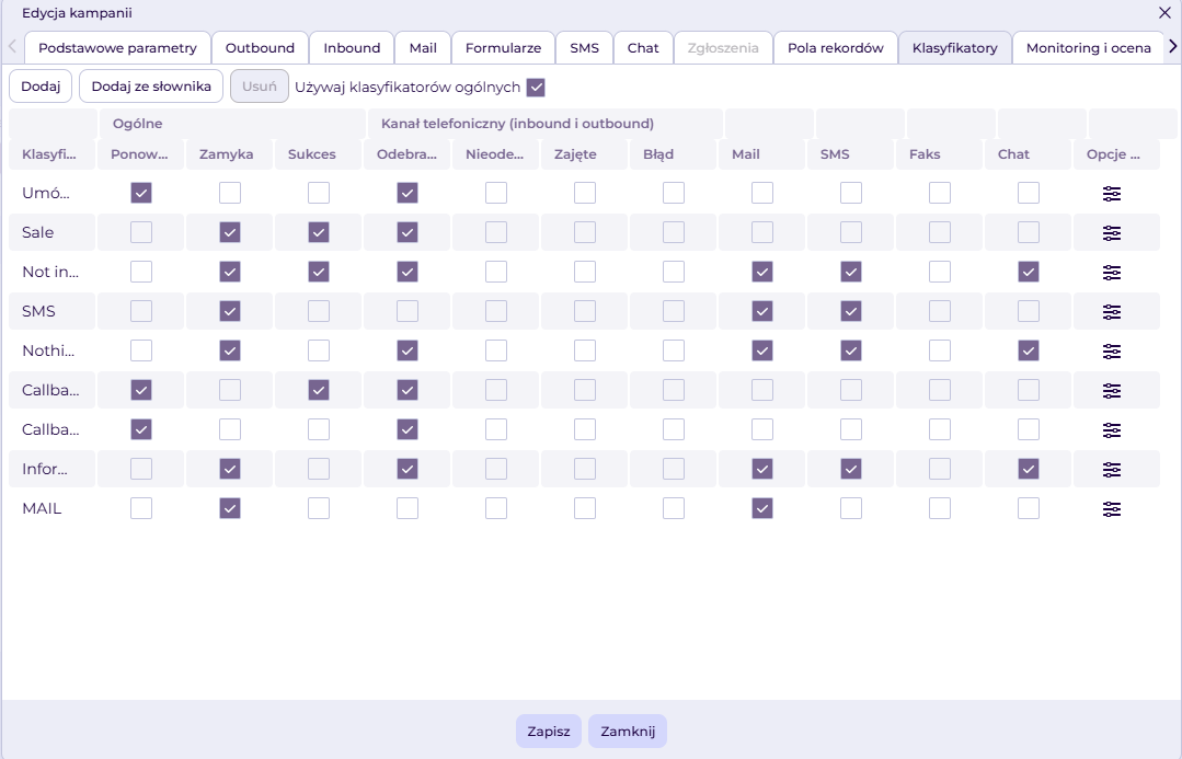 4. Kampania dla połączeń poza kampaniami – wybieramy kampanię, w której mają być odkładane połączenia realizowane poza kampanią.