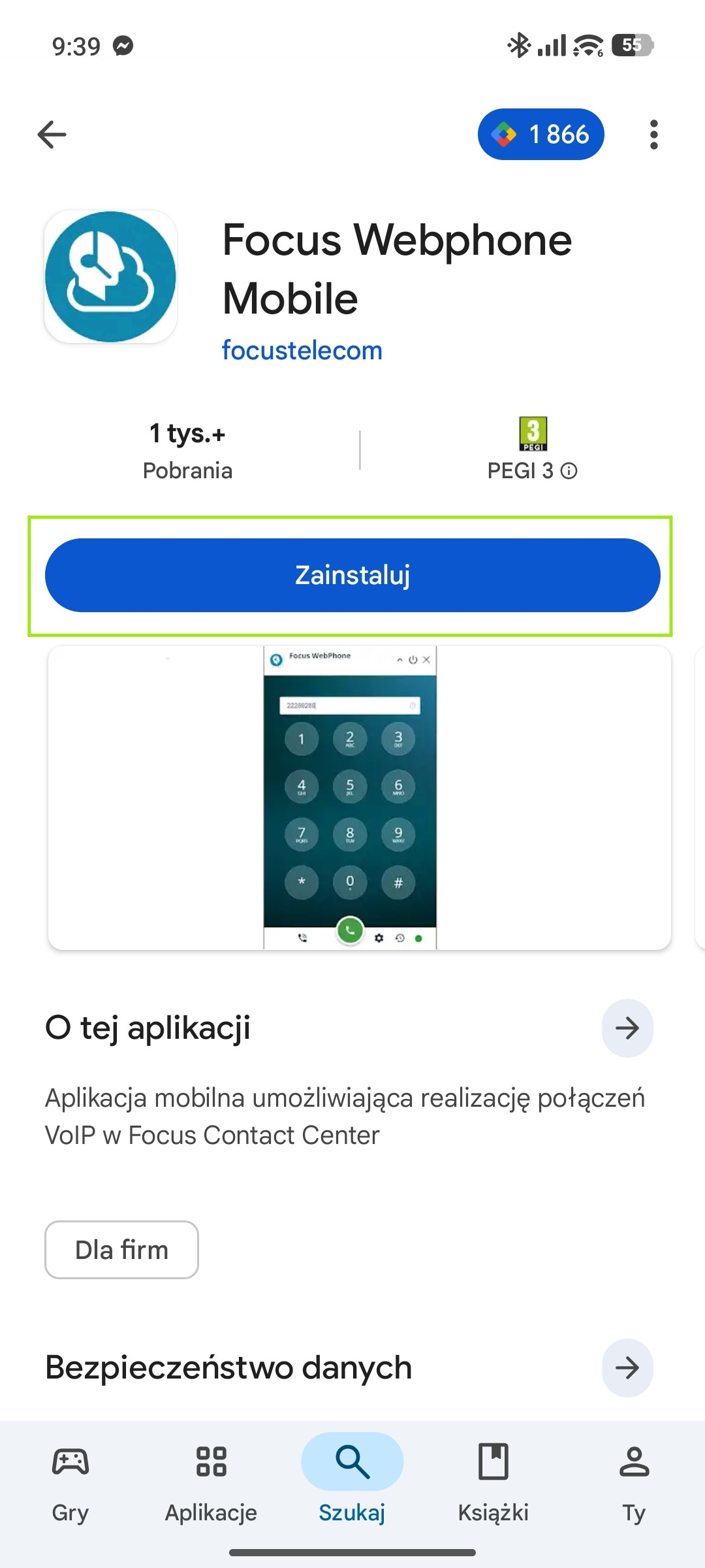 - Wyszukujemy aplikację WebPhone Mobile od Focustelecom.