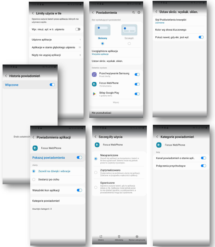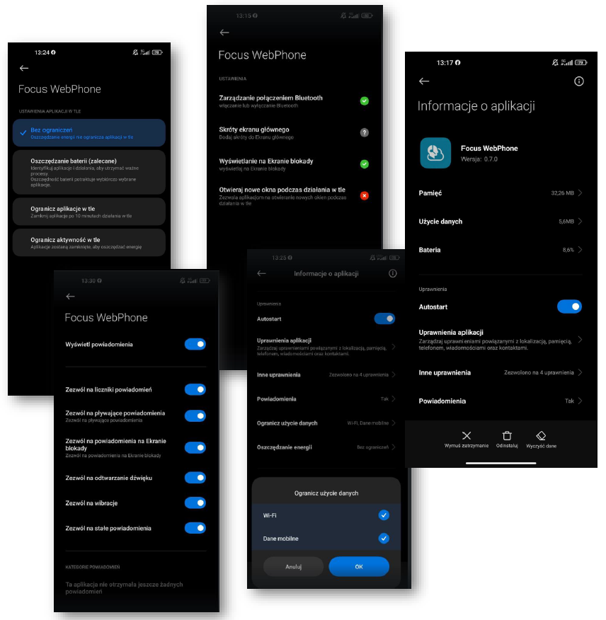 - wyłączone ograniczenia użycia danych dla aplikacji (zarówno dla Wi-Fi, jak i danych mobilnych),