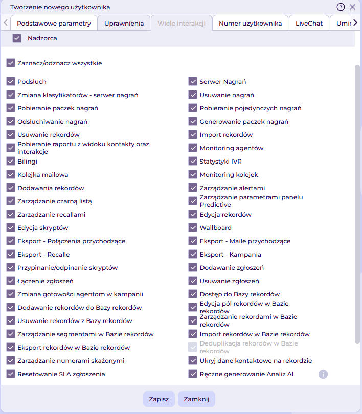 O uprawnieniach nadzorcy decyduje administrator. Konto nadzorcy służy przede wszystkim do monitorowania pracy agentów czy stanu kampanii, do których jest dodany. Poniżej widoczne są uprawnienia, które można nadać nadzorcy.