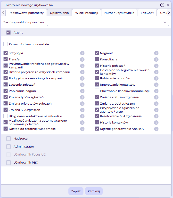 Tak jak w przypadku nadzorcy o uprawnieniach agenta decyduje administrator. Z konta agenta możliwe jest wykonywanie i odbieranie połączeń, obsługa maili czy czatów. Z tego poziomu możliwa jest praca w kampanii. Poniżej widoczne są uprawnienia, jakie agent może posiadać.