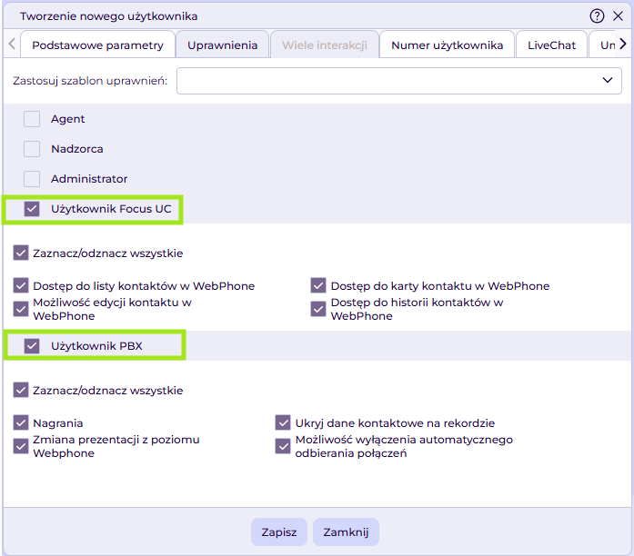 📌 W celu aktywacji uprawnień użytkownika Welyo UC konieczne jest w pierwszej koleności uprawnienia użytkownika PBX.