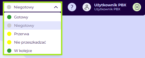 Status Gotowy umożliwia przyjmowanie i wykonywanie połączeń na numerze miejskim użytkownika PBX. W tym statusie użytkownik nie odbiera połączeń z kampanii.
