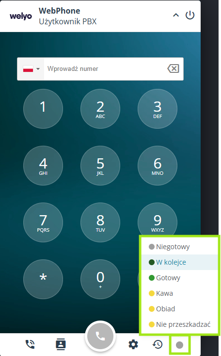 Zgłoszenie gotowości umożliwia agentom i użytkownikom PBX rozpoczęcie pracy w platformie Welyo lub na telefonie. Status gotowości pozwala obsługiwać połączenia w ramach kampanii lub na numerze miejskim użytkownika.