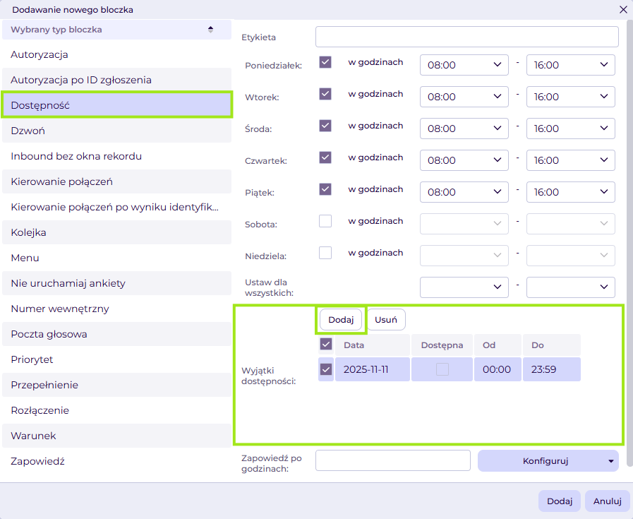 Standardowo infolinia działa od poniedziałku do piątku w godzinach 8:00-16:00. Jeśli chcesz, by w dniu 11.11.2025r. infolinia była niedostępna, dodaj wyjątek dostępności używając przycisku Dodaj. W utworzonym wyjątku nie zaznaczaj checkboxa dostępna oraz określ datę i godziny, w których wyjątek dostępności ma działać.