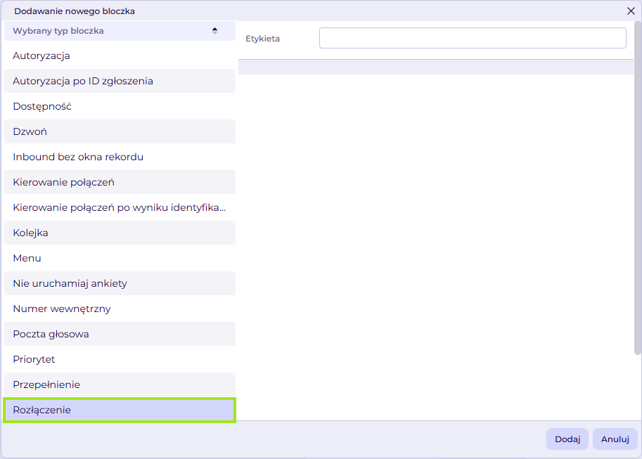 Po bloczku zapowiedzi musimy określić, co dalej ma się wydarzyć z połączeniem. W przypadku niedostępności infolinii możemy dodać bloczek Rozłączenie, który zakończy oczekujące połączenie.