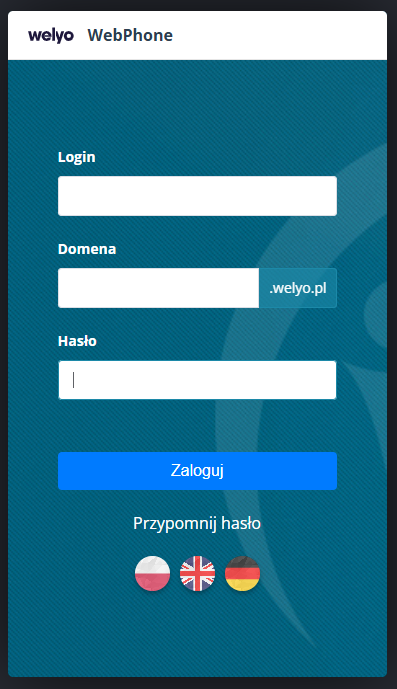 Logowanie przebiega bezpośrednio z widoku aplikacji WebPhone. Podczas logowania podajemy: