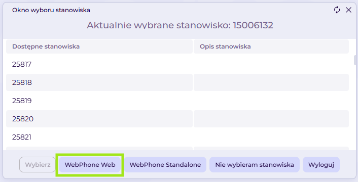 WebPhone Web możemy wywołać z poziomu aplikacji Welyo z Okna wyboru stanowiska po wybraniu przycisku WebPhone Web.