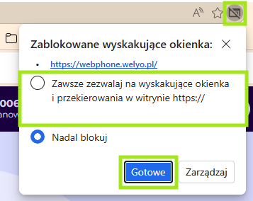 ℹ️ Przy pierwszym wywołaniu WebPhone Web na stanowisku / nowej przeglądarce koniecznie zwracamy uwagę na Zablokowane wyskakujące okienka, jeśli przeglądarka je zablokowała, wyrażamy zgodę na wyskakujące okienka.