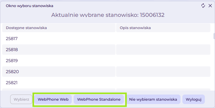 WebPhone wywołujemy poprzez kliknięcie odpowiedniego przycisku WebPhone Web lub WebPhone Standalone w Oknie wyboru stanowiska.
