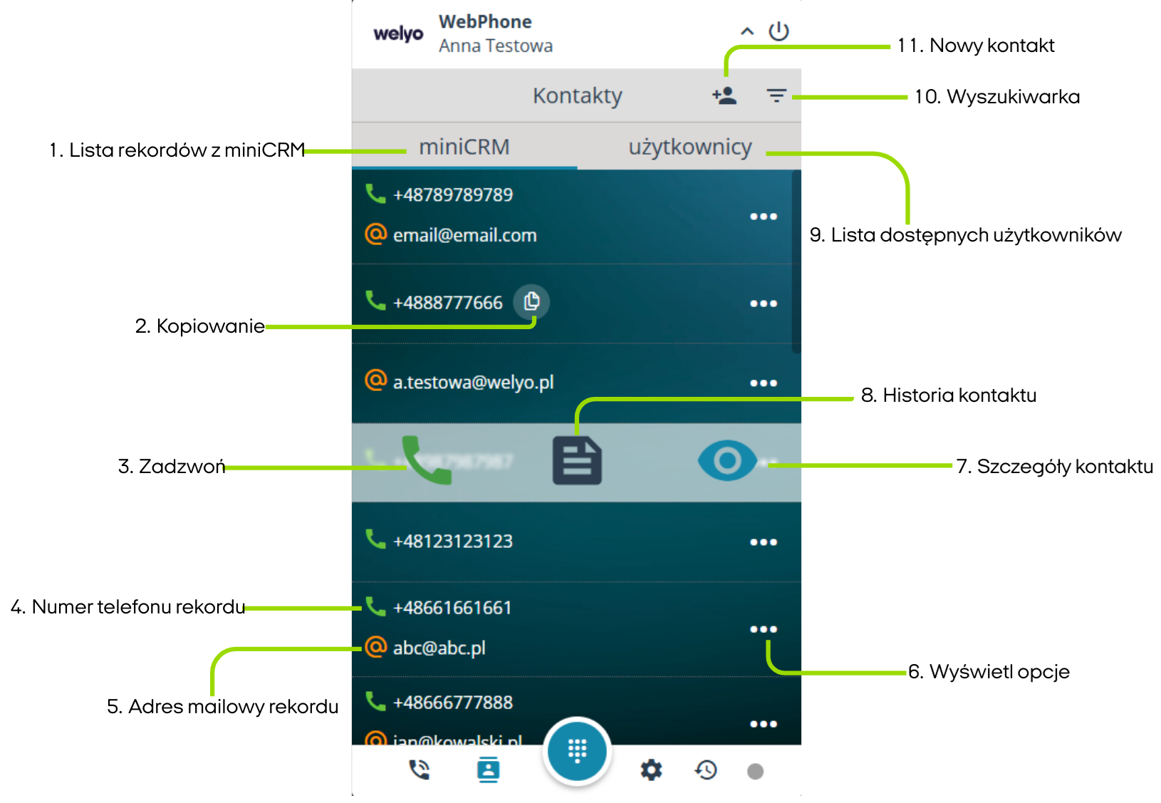 ℹ️ Lista kontaktów jest dostępna dla użytkowników Welyo UC z aktywną usługą miniCRM oraz odpowiednimi uprawnieniami: dostępem do listy kontaktów w WebPhone i do karty kontaktu w WebPhone.