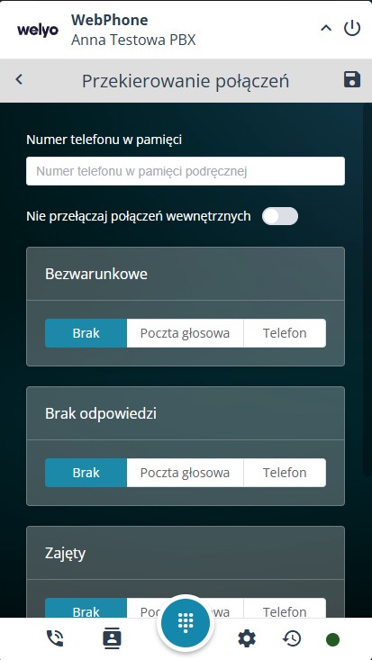 ℹ️ Z poziomu WebPhone można zapisać numer telefonu. Funkcja jest przydatna np. w sytuacji zmiany stanowiska pracy z WebPhone na aparat stacjonarny i konieczności ustawienia przekierowania za pomocą kodu centrali wprowadzanego na aparacie. Pole to może być również używane jako pole informacyjne – wpisanie numeru nie spowoduje automatycznie ustawienia przekierowania, dopóki nie wywołamy go kodem centrali.