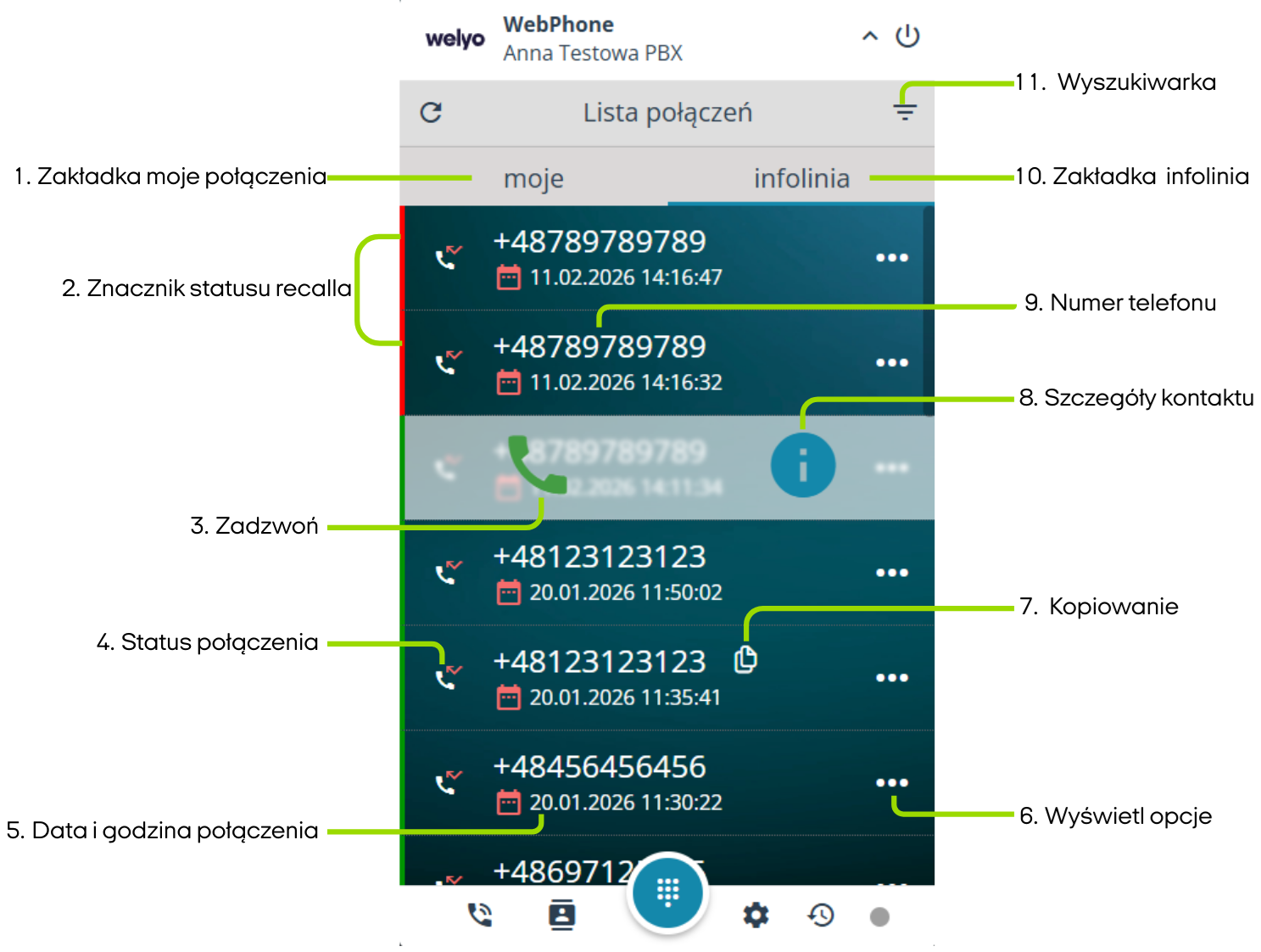 - Lista połączeń - widok listy połączeń kierowanych do użytkownika oraz nieodebranych w ramach infolinii.