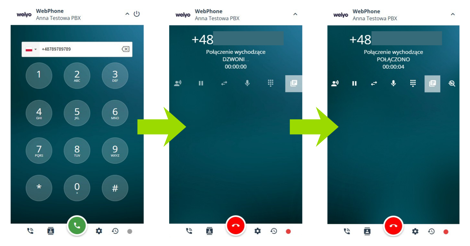 Połączenie wychodzące w WebPhone wykonuje się poprzez wpisanie numeru telefonu i kliknięcie ikony zielonej słuchawki. Numer można wprowadzić z klawiatury komputera lub korzystając z klawiatury numerycznej w WebPhone.