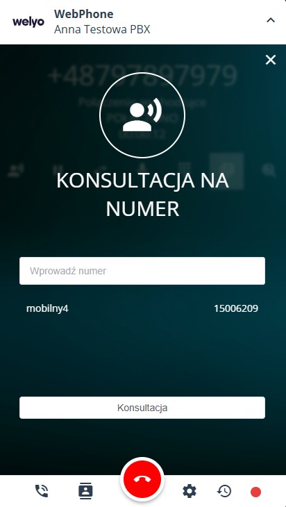 - Konsultacja – umożliwia wykonanie konsultacji z innym agentem w trakcie rozmowy z klientem. Po kliknięciu przycisku Konsultacja otworzy się okno, w którym należy wprowadzić numer, na który ma zostać wykonana konsultacja (numer docelowy), lub wybrać użytkownika z listy dostępnych agentów w kampanii. W tym czasie klient zostanie przełączony na muzykę oczekiwania.