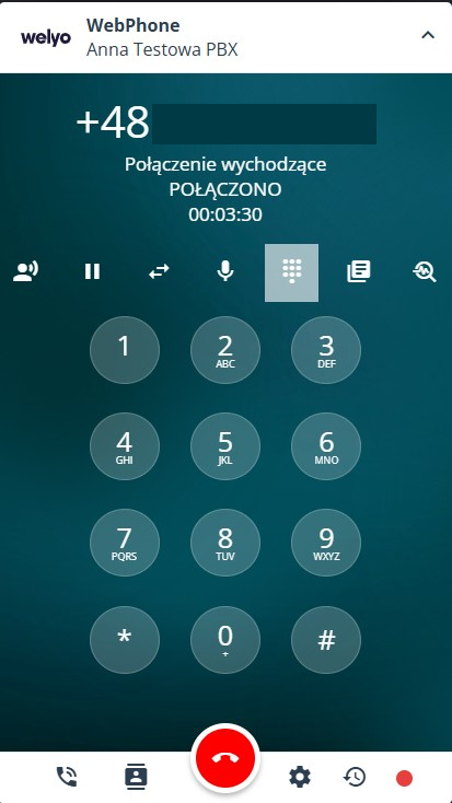 Po zalogowaniu dostępne będą wszystkie funkcje WebPhone’a. Pierwszy widok to klawiatura numeryczna.