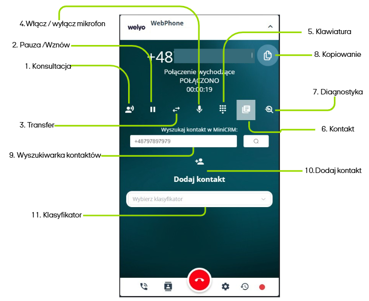 Przycisk ten wywoła otworzenie strony z WebPhone - https://webphone.welyo.pl/