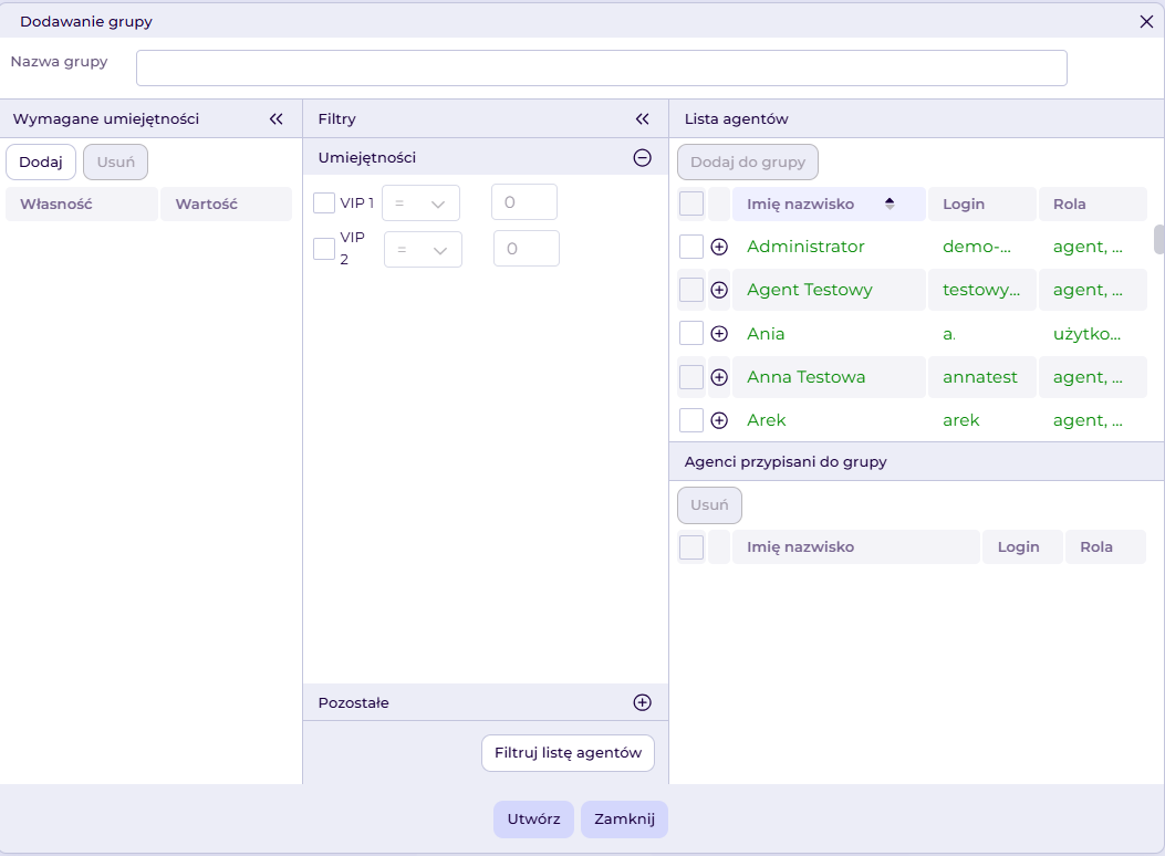 Funkcja ta umożliwia utworzenie grupy, do której będzie można przypisać wybranych użytkowników. Grupę będzie można przypisać do kolejek i kampanii. Każda z grup będzie mogła posiadać zestaw umiejętności, które agenci będą musieli spełniać, jeśli mają być dodani do grupy. W przypadku edycji kont agentów system automatycznie sprawdzi, czy dany agent będzie mógł w dalszym ciągu należeć do grupy.