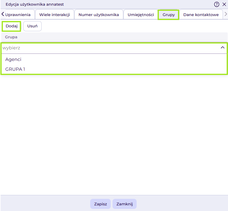 W zakładce Grupy widoczne są wszystkie grupy, do których dany użytkownik jest dodany. Tutaj też możliwe jest dodanie agenta do wybranej grupy. W tym celu należy kliknąć przycisk Dodaj i wybrać grupę z listy. Po zdefiniowaniu grupy należy zapisać zmiany za pomocą przycisku Zapisz.