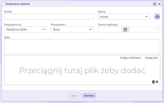 - Obszar dodawania plików – w tym miejscu możliwe jest dodanie plików do zadania, np. grafik czy plików tekstowych. Pliki dodać można przenosząc je w dany obszar, wybierając je z biblioteki lub za pośrednictwem okna systemowego. Maksymalny rozmiar pojedynczego załącznika to 25MB. Po najechaniu na załącznik możemy go pobrać lub usunąć. W prawym dolnym rogu znajdują się przyciski usuwania i pobierania, które pozwolą wykonać daną akcję dla wszystkich załączników jednocześnie.