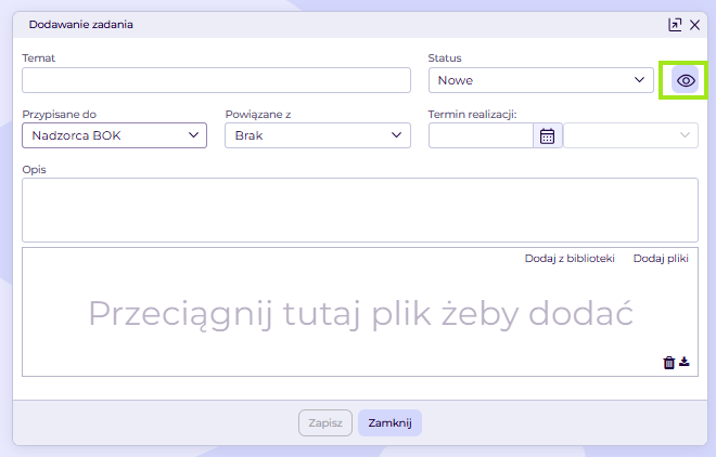 - Status – definiujemy tu status zadania, który pozwoli określić etap prac. Do wyboru są trzy opcje: nowe, w trakcie oraz zamknięte.