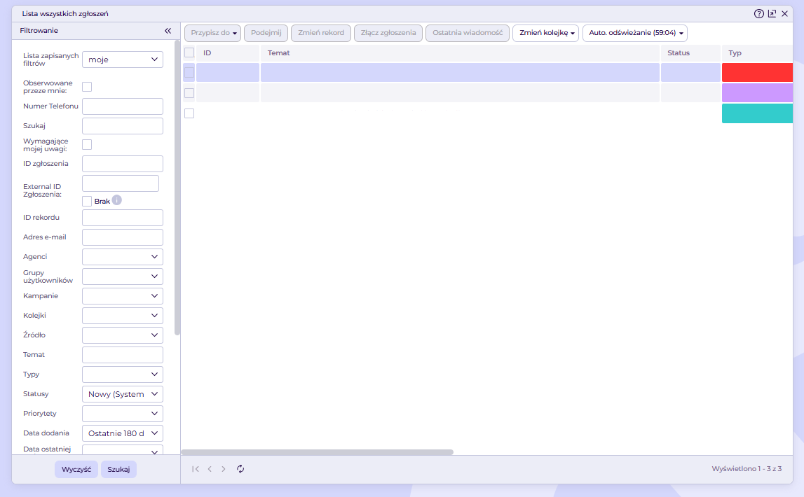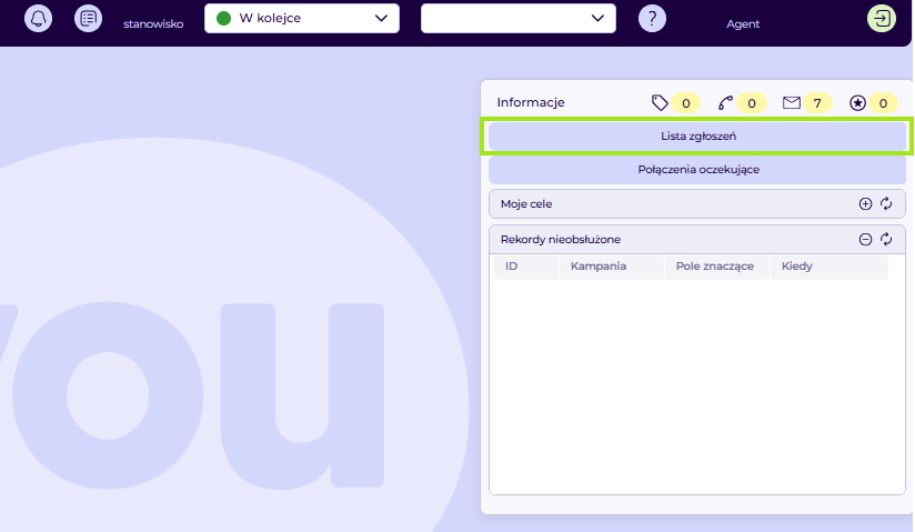 Po zalogowaniu do panelu agenta i zgłoszeniu gotowości przechodzimy do listy zgłoszeń.