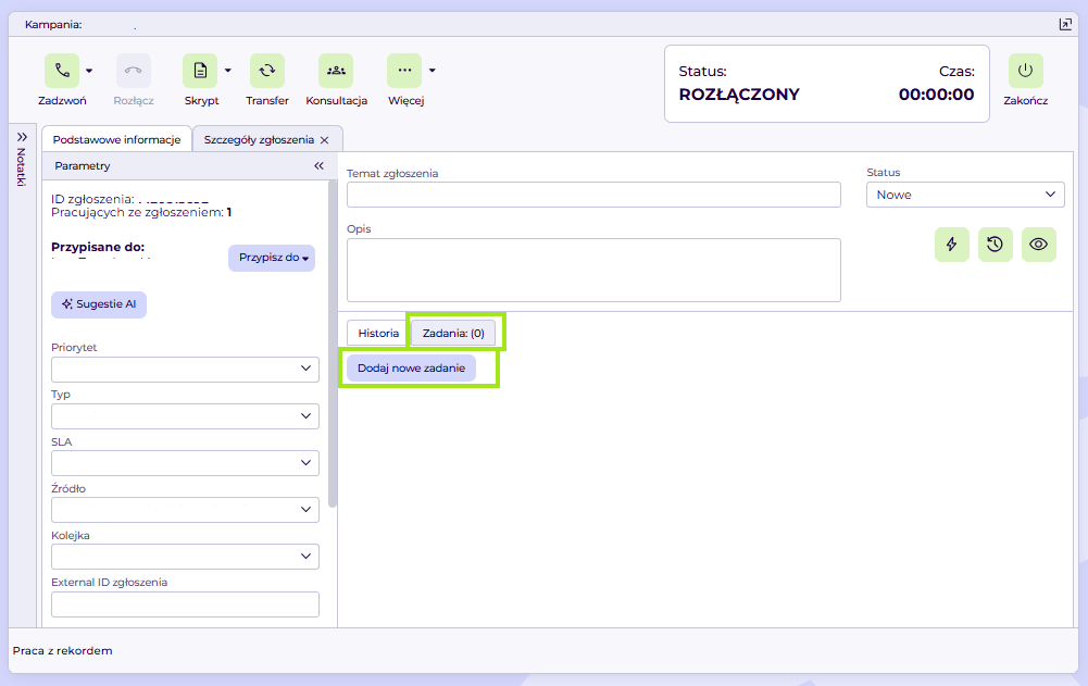 W karcie zgłoszenia możliwe jest też dodanie nowego zadania. W tym celu należy kliknąć przycisk dodaj nowe zadanie.