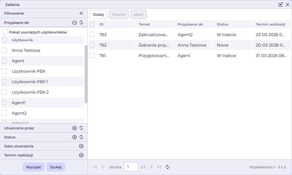 - Status – określamy etap realizacji (nowe, w trakcie, zamknięte)