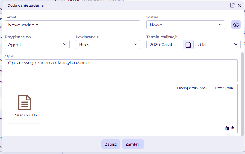 - Przypisane do – wskazujemy użytkownika odpowiedzialnego za zadanie