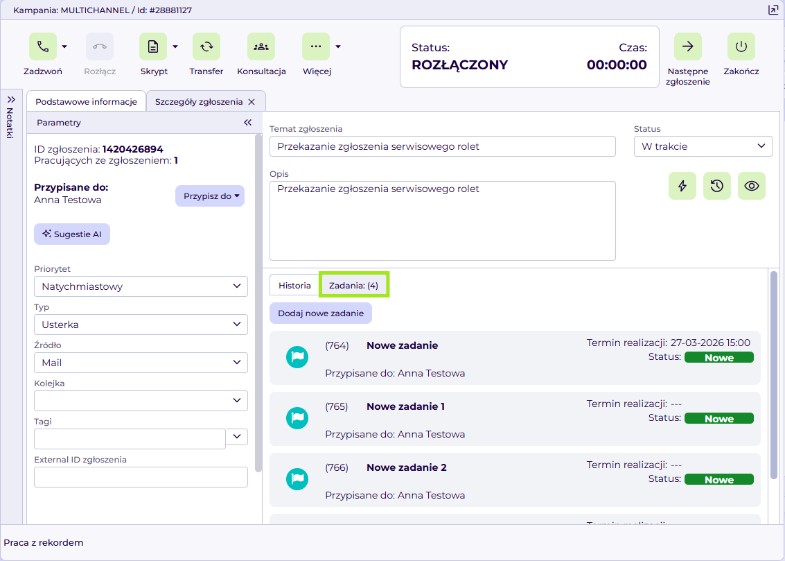 Lista wszystkich zadań przypisanych do zgłoszenia jest dostępna w jego karcie.