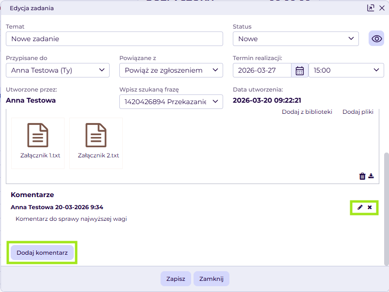 ℹ️ Administrator i Nadzorca platformy może edytować/usuwać wszystkie komentarze dodane w ramach zadania - nie tylko te dodane przez niego.