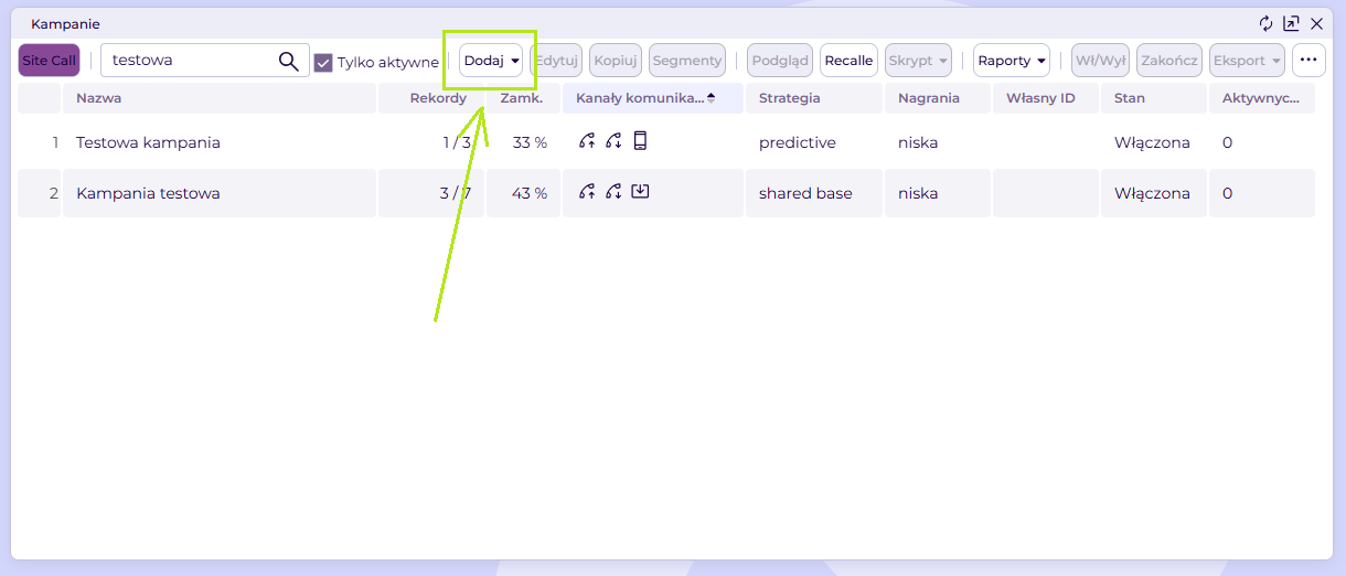 Aby utworzyć nową kampanię należy kliknąć przycisk Dodaj.