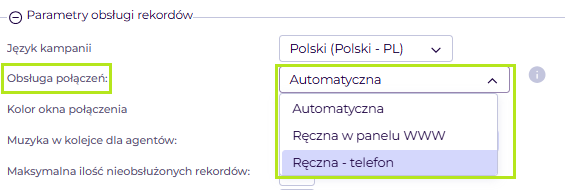 Jako pierwszy parametr należy wybrać, w jakim języku będzie pracowała kampania. Następnie zdefiniować tryb obsługi połączeń. System daje możliwość wyboru jednego z trzech trybów połączeń: