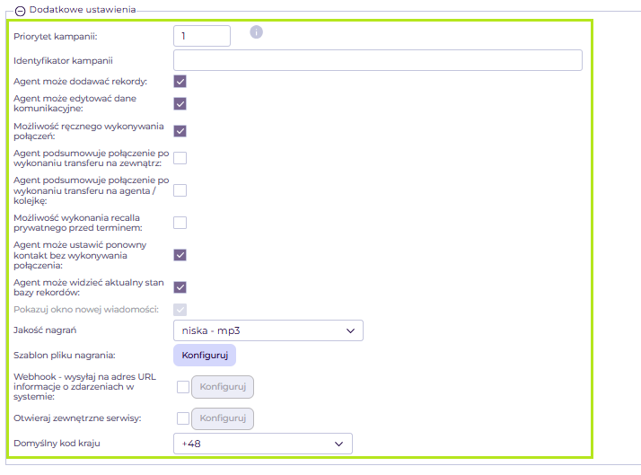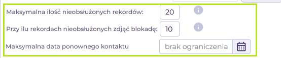 Maksymalna ilość nieobsłużonych rekordów mówi o tym, ile maksymalnie rekordów agent może nie podsumować po zakończeniu połączenia. Zaleca się ustalić możliwie małą liczbę. W momencie osiągnięcia maksymalnej wartości, lista kampanii agenta jest blokowana, agent nie może wydzwonić rekordu oraz połączenia nie będą przydzielane.