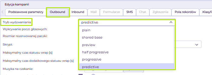 - predictive - system w pełni automatycznie inicjuje każde połączenie i przekazuje do Agenta oczekującą na rozmowę osobę. Predictive wydzwania zawsze dwa razy więcej rekordów niż agentów pracujących w kampanii.