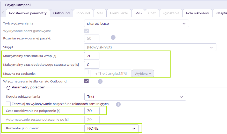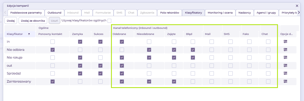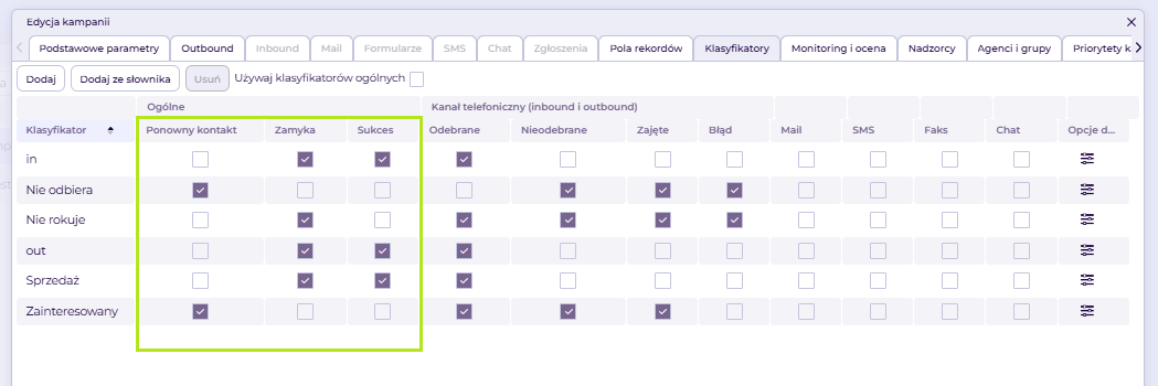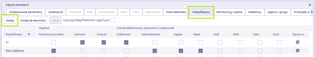 Dla tworzonej kampanii, dla połączeń odebranych ustawmy zarówno klasyfikator recall, jak i zamknij.