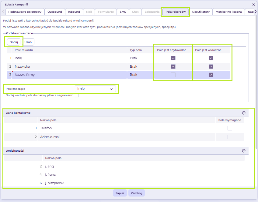 Zakładka ta służy do definiowania pól, z których składać się będzie rekord w tej kampanii, np. Imię, Nazwisko, PESEL