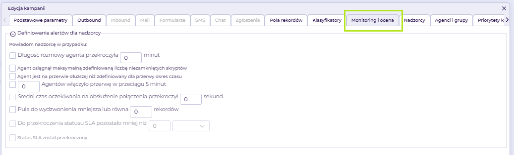 Przejdź na zakładkę „Monitoring i ocena”. Tutaj możesz zdefiniować alerty dla Nadzorcy. Jeśli dane zdarzenie wystąpi w systemie, Nadzorca zostanie o tym poinformowany w panelu.